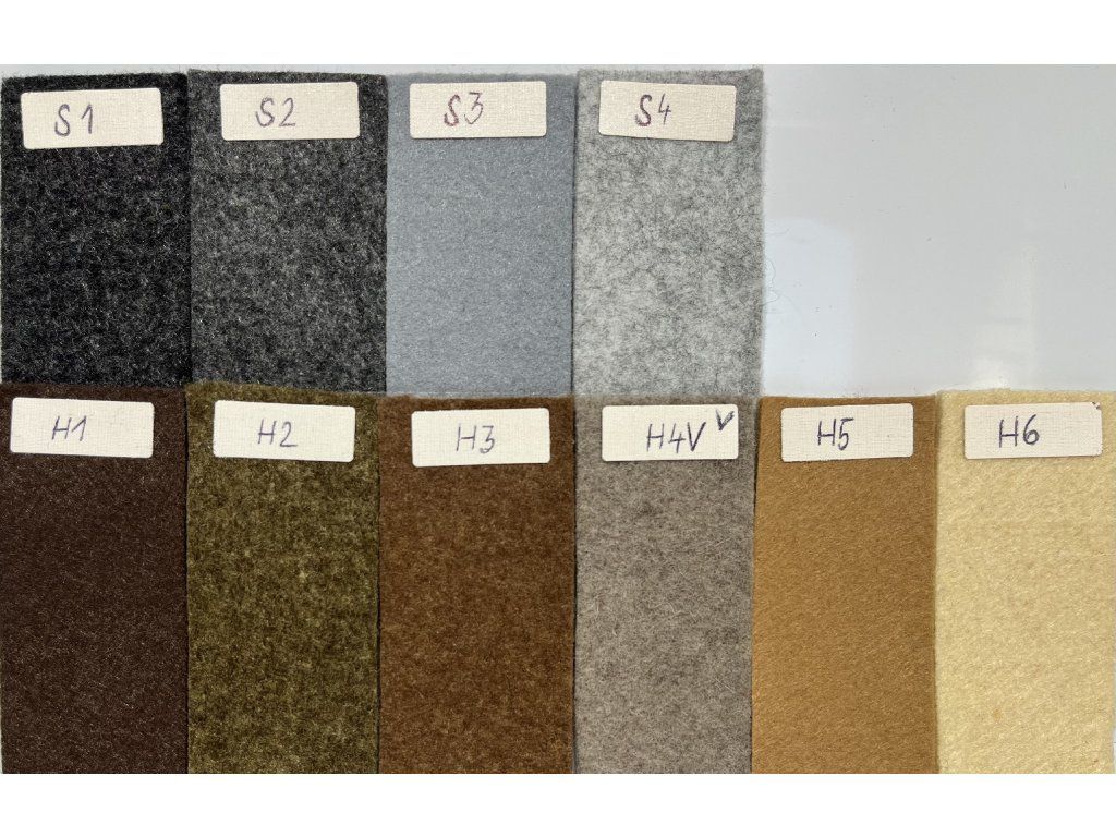 Materiál: filc 3 mm, 100% polyester nebo s příměsí vlny min. 70% - název odstínu obsahuje “V”. Např. Z1V