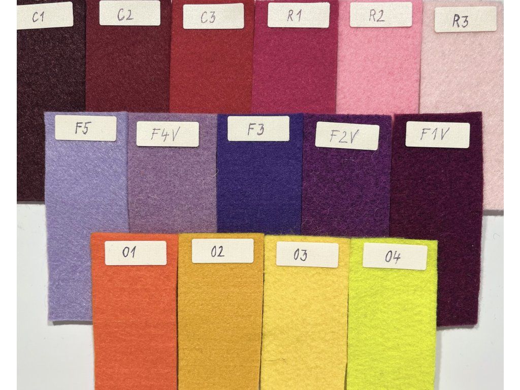 Materiál: filc 3 mm, 100% polyester nebo s příměsí vlny min. 70% - název odstínu obsahuje “V”. Např. Z1V